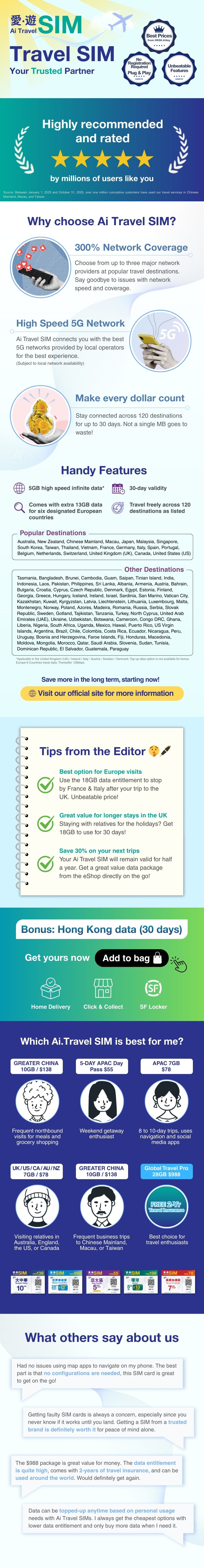 The most handy travel SIM in Hong Kong, "Ai Travel SIM", is finally here! Whether you're planning a northbound flash trip for dim sum, a multi-day Shanghai-Beijing tour, or a round-island Taiwan adventure, our 【30-DAY GLOBAL 5GB FUP】 travel package is your best choice! Use our service with unprecedented flexibility across the globe. With "Ai Travel SIM" in hand, enjoy a carefree plug-and-play experience with instant access to major social media platforms, no VPN needed!