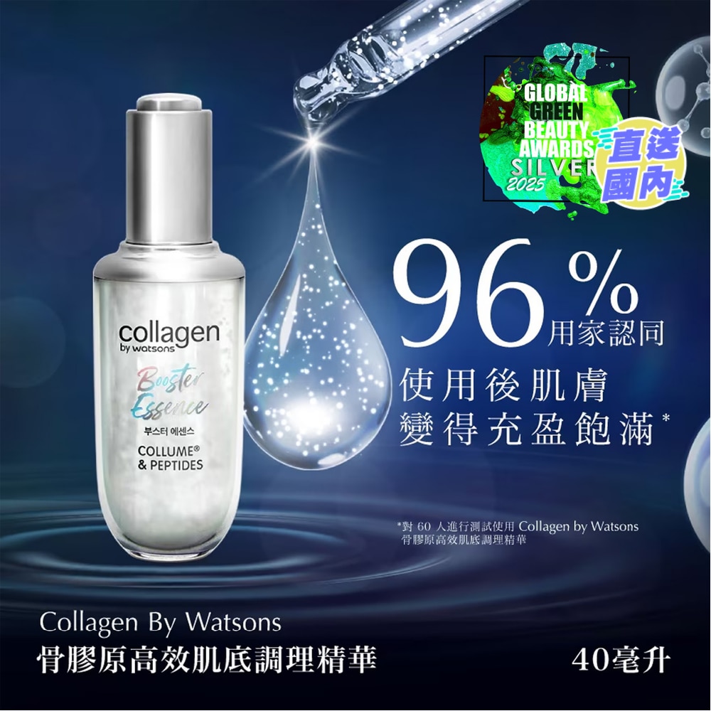 COLLAGEN BY WATSONS BOOSTER ESSENCE COLLUME® & PEPTIDES IS POWERFUL BLEND OF VEGAN COLLAGEN COMPLEX, TOGETHER WITH PEPTIDES, PANTHENOL, ADENOSINE, NIACINAMIDE (VITAMIN B3) AND HYALURONIC ACID. ITS GOLDEN RATIO OF FORMULATION WORKS TO BOOST SKIN ELASTICITY AND STRENGTHEN THE SKIN'S MOISTURE.