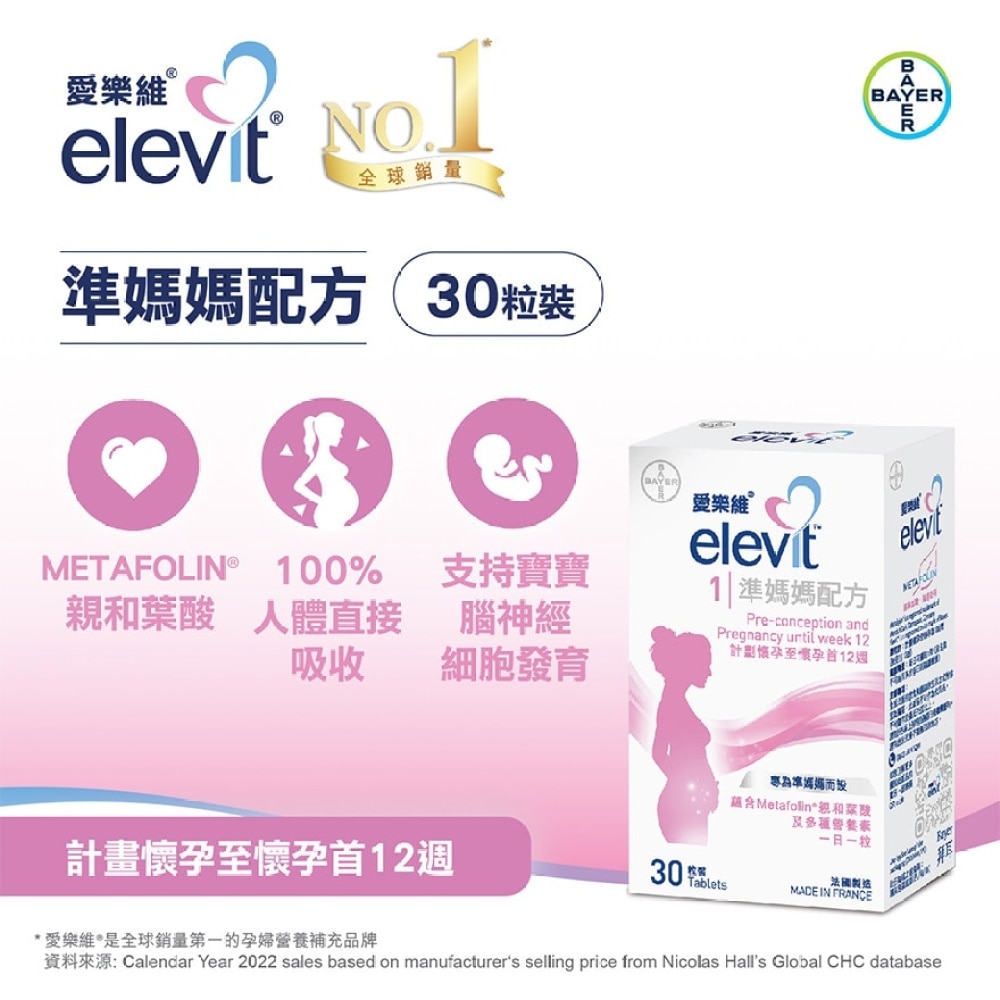 Elevit® is a Prenatal supplement brand from the German pharmaceutical company Bayer, and has been the No.1 global Prenatal Multivitamin brand in value terms*.Elevit® understands that pregnant women have special nutritional requirements during pregnancy¹. As such, it offers tailored -nutrition over 3 key stages over pregancy journey : from planning/pre-conceptations to pregancy to lactations to support better growth of their baby with a tablet a day.Benefit- Designed to for women planning for pregnancy and first trimesters over pregancy stage (up to 12 weeks)- Elevit® Pronatal Formula contains folic acid 800mcg including Metafolin® , a form of folate that can be 100% utilized by the body- Contains a wide range of vitamins, minerals and trace elements to healthy development of you and your baby, and prepare you both for a great start