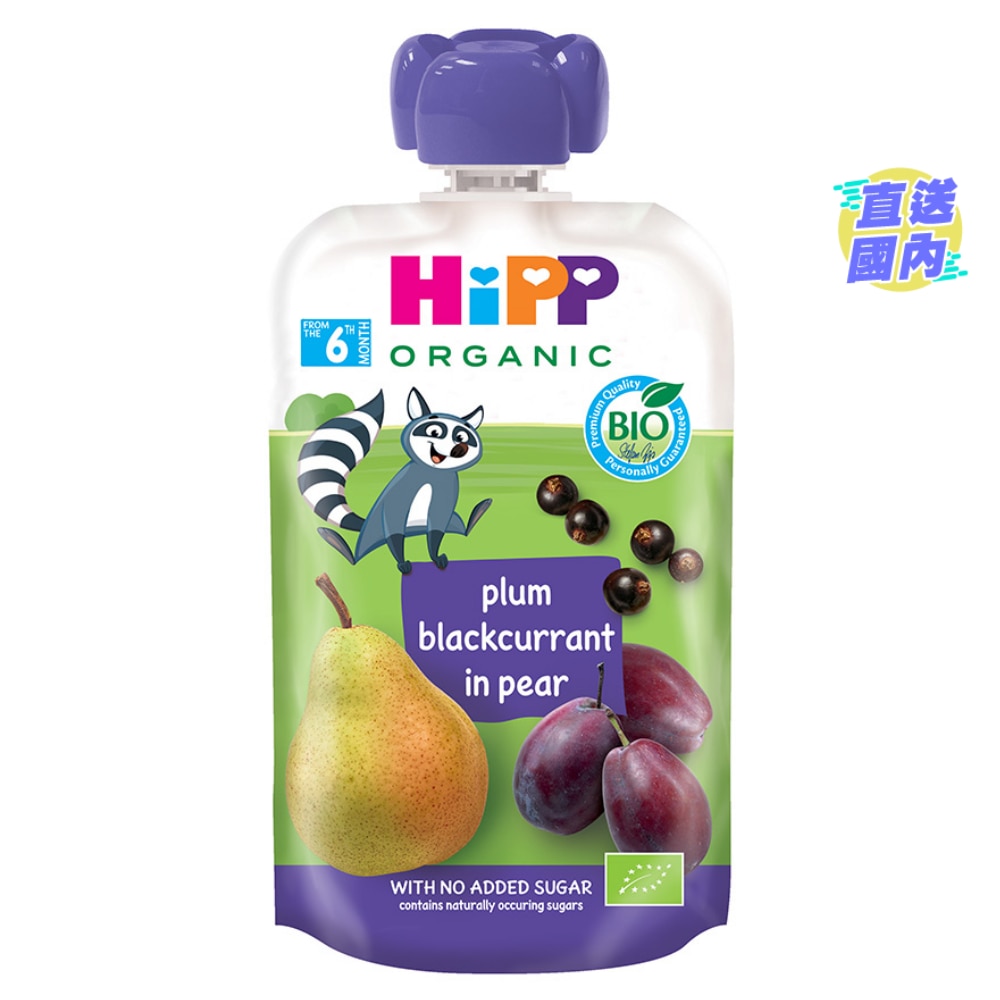 HiPP Organic Plum-Blackcurrant in pear 100% fruitNo added sugar (ingredients naturally contain sugar)Finely pureedOrganic