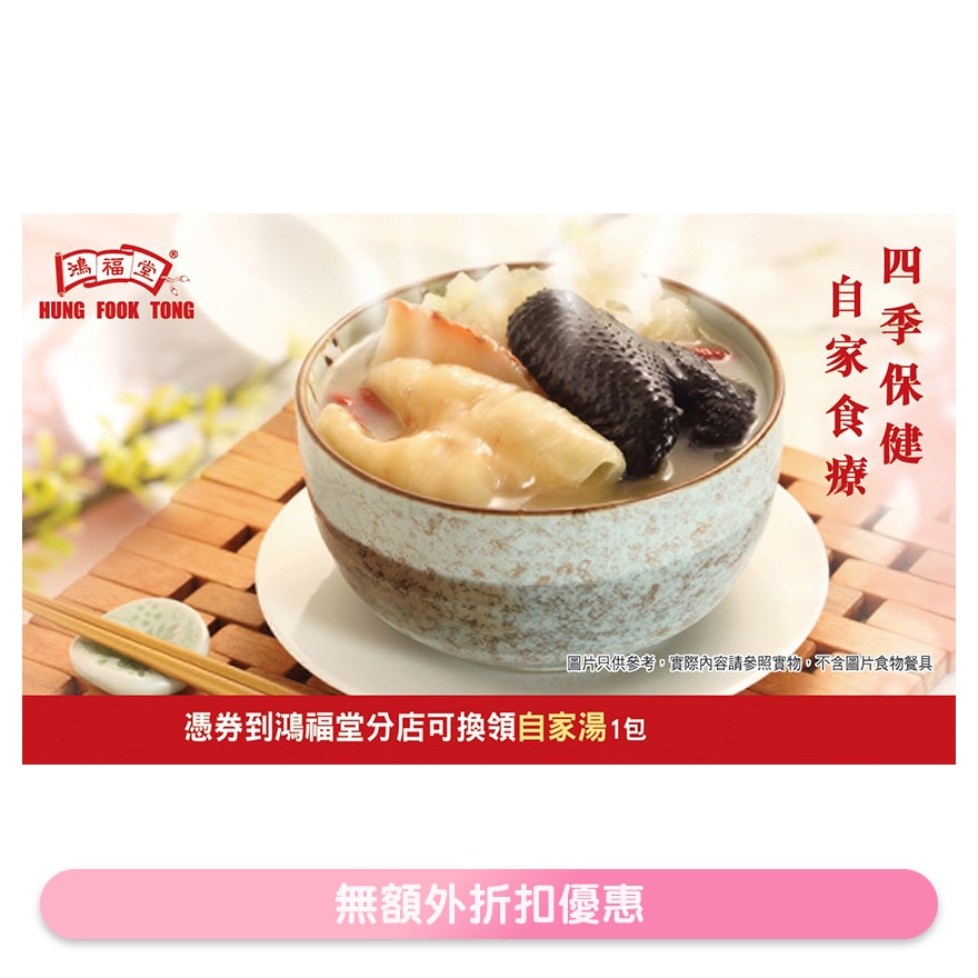 - THIS COUPON CAN BE USED TO REDEEM ANY ONE OF OUR HEALTHY HOME-MADE SOUPS VALUED AT HK$60 OR BELOW AT ANY HUNG FOOK TONG STORES IN HONG KONG.