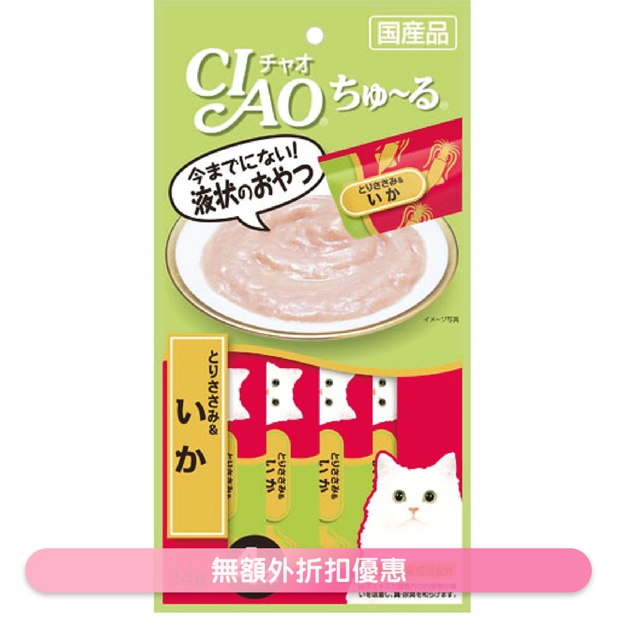 Chicken breast、Squid extract、Hydrolyzed protein、Sugar (Oligosaccharides etc.)、Vegetable oil、Thickener (Processed starch)、Minerals、Polysaccharide thickener、Flavorings (Amino acids etc.)、Vitamin E、Red yeast rice coloring、Green tea extract