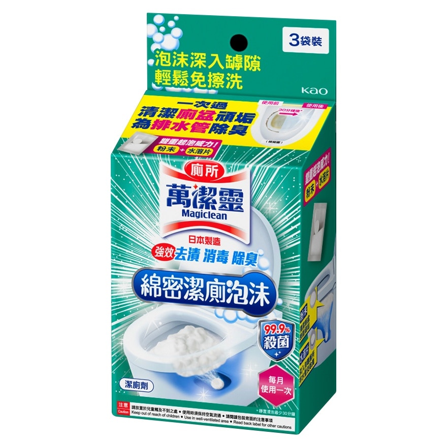 1st power: [Powder] Forming high density cleaning foam which penetrates into the crevices of toilet bowl, removes black stains and yellowing thoroughly* at where the foam contacts at the toilet bowl# , whitening at where the foam contacts and no need to rinse bottom of toilet bowl anymore