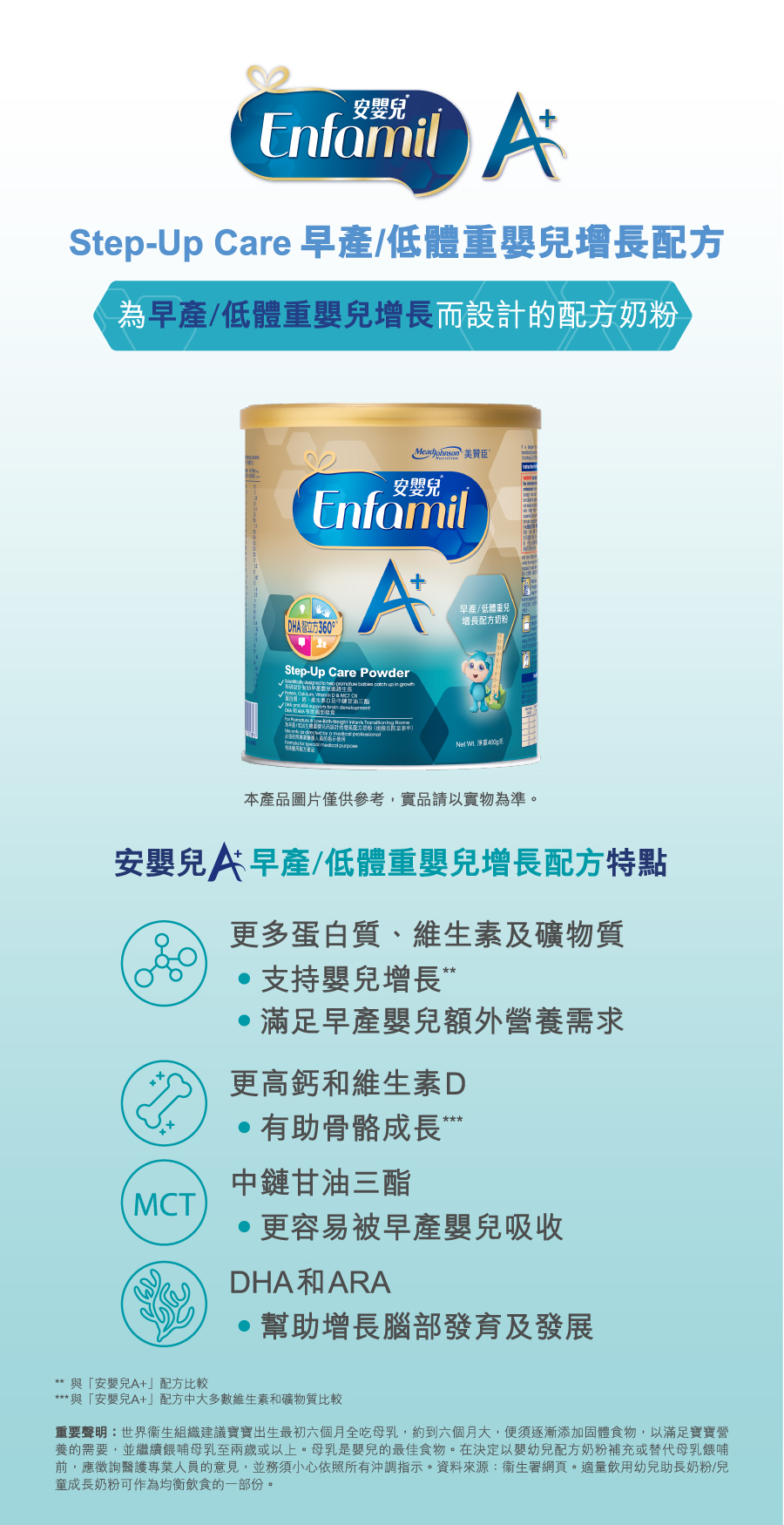 Blend of vegetable oils (coconut, high oleic sunflower, medium chain triglycerides (mct) and soybean oils) (plant), whey protein concentrate (cow’s milk), corn syrup solids (plant), nonfat milk powder (cow’s milk), lactose (cow’s milk), minerals (calcium carbonate, calcium phosphate, cupric sulfate, ferrous sulfate, magnesium chloride, manganese sulfate, sodium chloride, sodium citrate, sodium iodide, sodium selenite and zinc sulfate), single cell oils (Mortierella alpina oil, Crypthecodinium cohnii oil) as sources of Arachidonic acid (ARA) and Docosahexaenoic acid (DHA), emulsifier (soy lecithin) (plant), vitamins (alpha-tocopheryl acetate, biotin, calcium pantothenate, cholecalciferol, choline chloride, cyanocobalamin, folic acid, niacinamide, phytonadione, pyridoxine hydrochloride, riboflavin, sodium ascorbate, thiamine hydrochloride and vitamin A palmitate), inositol, taurine, nucleotides (adenosine monophosphate, cytidine monophosphate, guanosine monophosphate and uridine monophosphate), antioxidants (ascorbic acid and ascorbyl palmitate), L-carnitine and acidity regulator (potassium hydroxide).