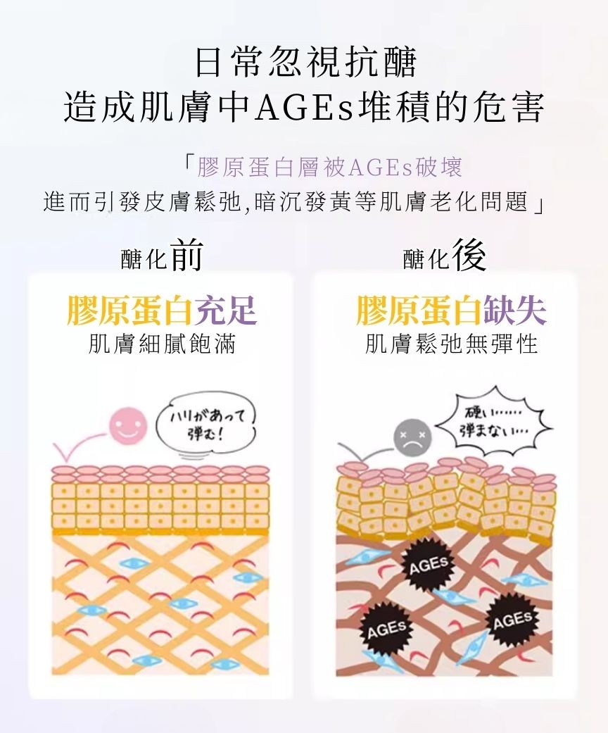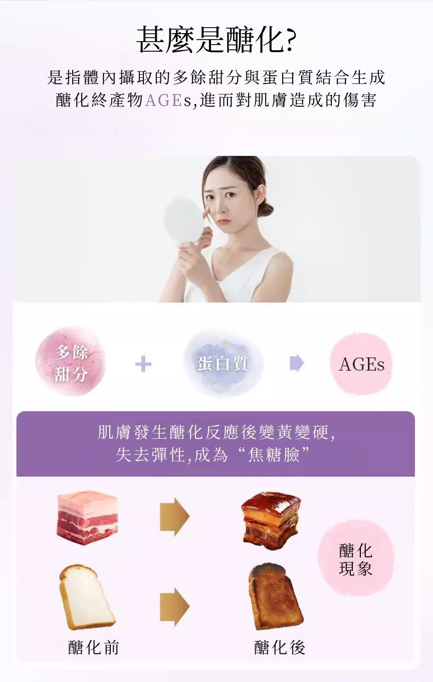 Frequent consumption of high-sugar foods and staying up late can damage collagen through glycation, leading to rapid skin aging! Want to avoid losing collagen through glycation? Besides replenishing collagen, you also need to combat glycation!