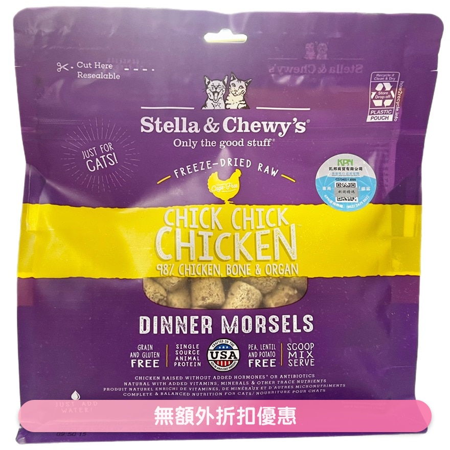 Chicken (ground with bone), chicken liver, chicken gizzard, pumpkin seed, potassium chloride, sodium phosphate, choline chloride, fenugreek seed, dried Pediococcus acidilactici fermentation product, dried Lactobacillus acidophilus fermentation product, dried Bifidobacterium longum fermentation product, dried Bacillus coagulans fermentation product, taurine, tocopherols (preservative), dandelion, dried kelp, zinc proteinate, iron proteinate, vitamin A supplement, vitamin E supplement, niacin supplement, copper proteinate, riboflavin supplement, sodium selenite, d-calcium pantothenate, biotin, manganese proteinate, thiamine mononitrate, pyridoxine hydrochloride, vitamin D3 supplement, folic acid, vitamin B12 supplement.