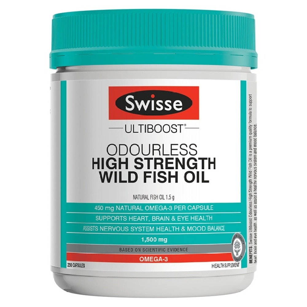 Swisse Ultiboost Odourless High Strength Wild Fish Oil is a multi-nutrient formula to supplement your nutrition. It comes in vanilla coated capsules to protect from fishy odour. Swisse Ultiboost Odourless High Strength Wild Fish Oil has been developed to high quality standards to provide a high strength Omega-3 Fish Oil in a convenient dose.