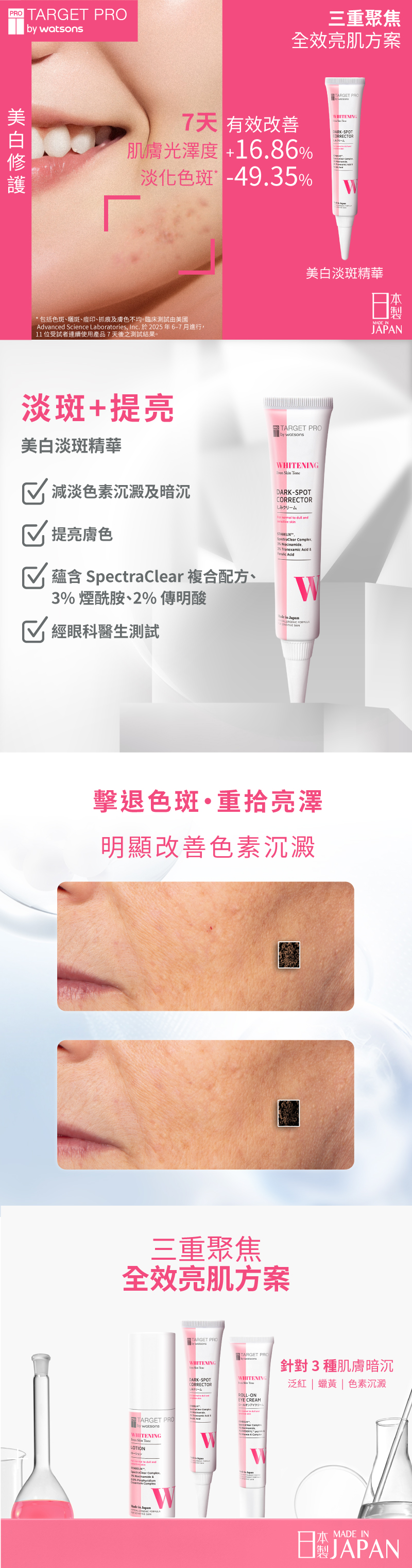 **INCLUDES SPOTS, DULLNESS, ACNE SCARS, SCRATCHES, AND UNEVEN SKIN TONE** THE CLINICAL TRIAL RESULTS CAME FROM ADVANCED SCIENCE LABORATORIES, INC. IN THE UNITED STATES, AFTER 11 VOLUNTEERS USED THE PRODUCT CONTINUOUSLY FOR 7 DAYS.
