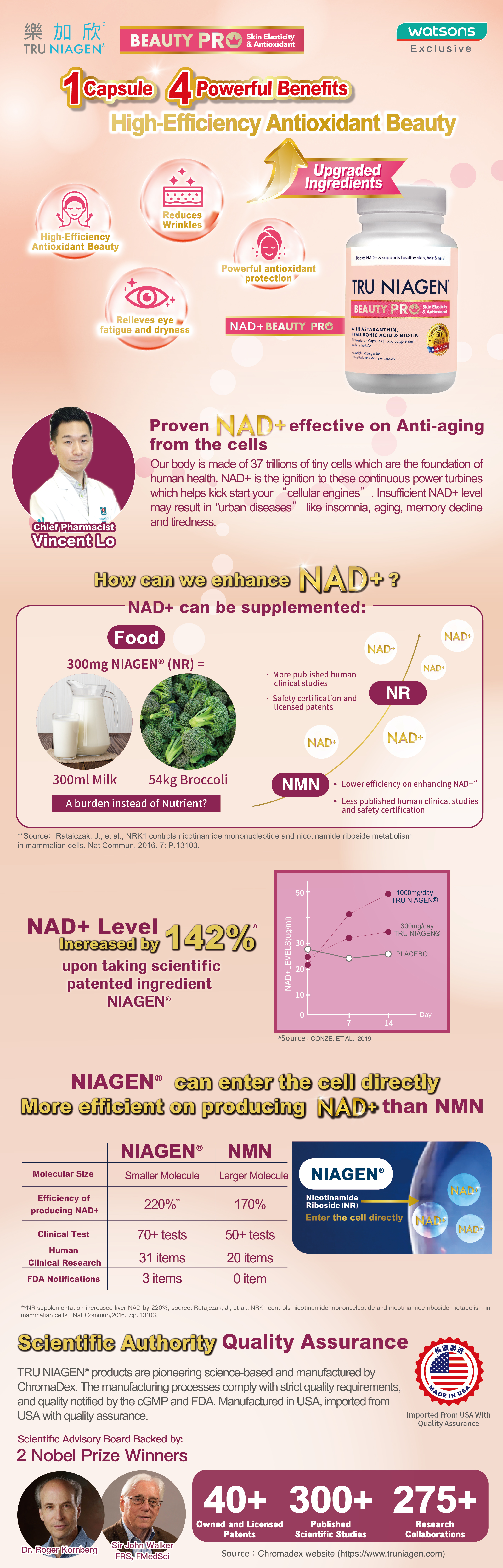 Scientific Patented Ingredient NIAGEN® can enter cell directly, proven more efficient on producing NAD+ when compare with NMN.