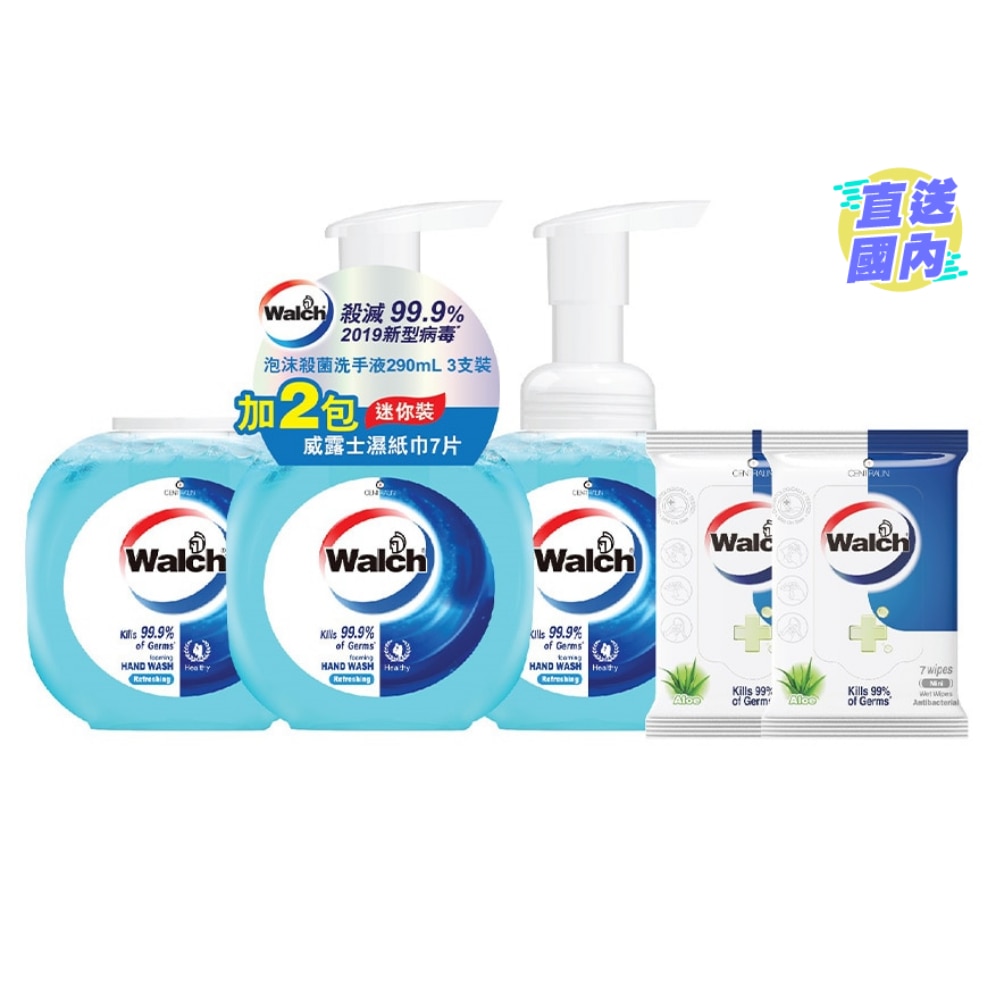 Walch Antibacterial Foaming Hand Wash Refreshing 290ml*3+Walch Antibacterial Mini Wet Wipes Aloe 7 wipes*2