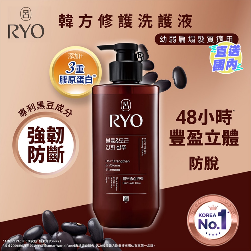 呂RYO韓方修護洗髮液 (幼弱扁塌髮質適用) 針對幼弱扁塌髮質,改善髮絲軟弱問題,強韌髮根,減少20%髮絲斷裂,持續48小時豐盈立體*
