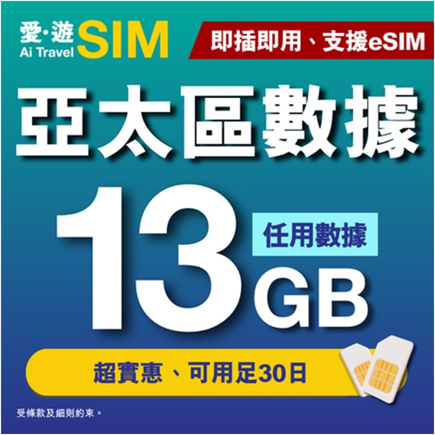 全港最贴心既「爱.游SIM」外游数据卡全新上市~无论你想每周快闪不同亚太城市,定系一次过玩尽五日,【30日亚太区13GB FUP】数据卡都是你的至佳选择!30日超长有限期,随时于日本、南韩、新加坡、马来西亚、泰国、内地、台湾等地自由配搭使用,由举家旅行到频密快闪族都统统啱用。有「爱.游SIM」旅行数据卡在手,即插即用无烦恼仲弹性超高,与你从新定义旅行数据自由!