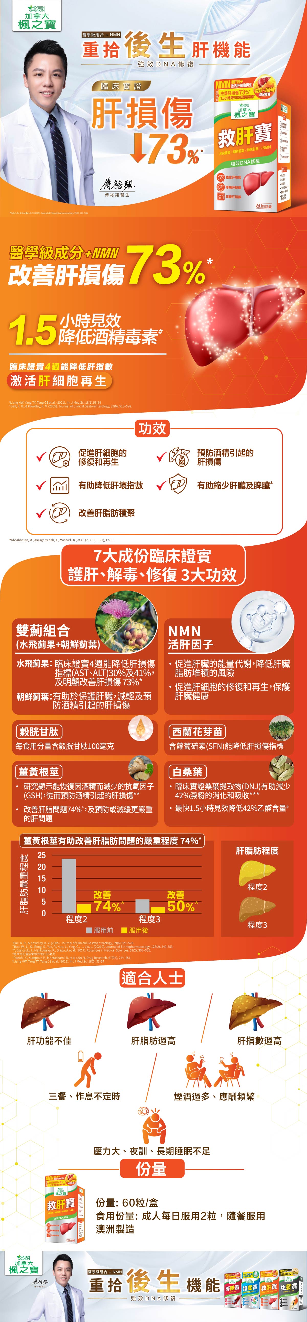 • 水飞薊果:临床证实4周能降低肝损伤指标(AST、ALT)30%及41%,并明显改善肝损伤73%*