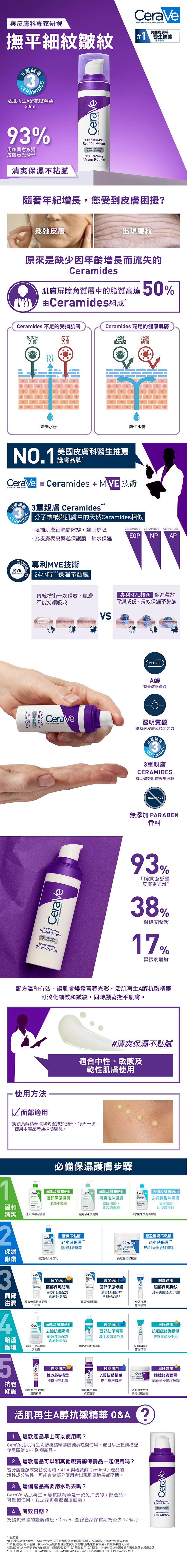 *70名受试者每天使用一次CERAVE活肌再生A醇抗皱精华8周后之临床测试。实际效果因人而异
