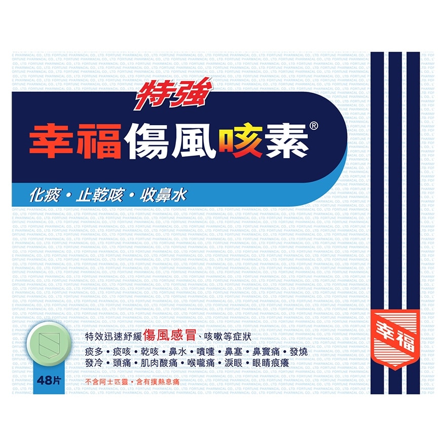 特强伤风感冒止咳综合配方,有效纾缓伤风感冒及咳嗽所引起的12大症状,包括发烧、流鼻水、打喷嚏、鼻塞、头痛、肌肉酸痛、喉咙痛、眼部痕痒和泪眼等。特别加入止咳祛痰成份,有效针对感冒引起的干咳,痰咳和浓痰。不含阿士匹灵,甚少引致肠胃不适。