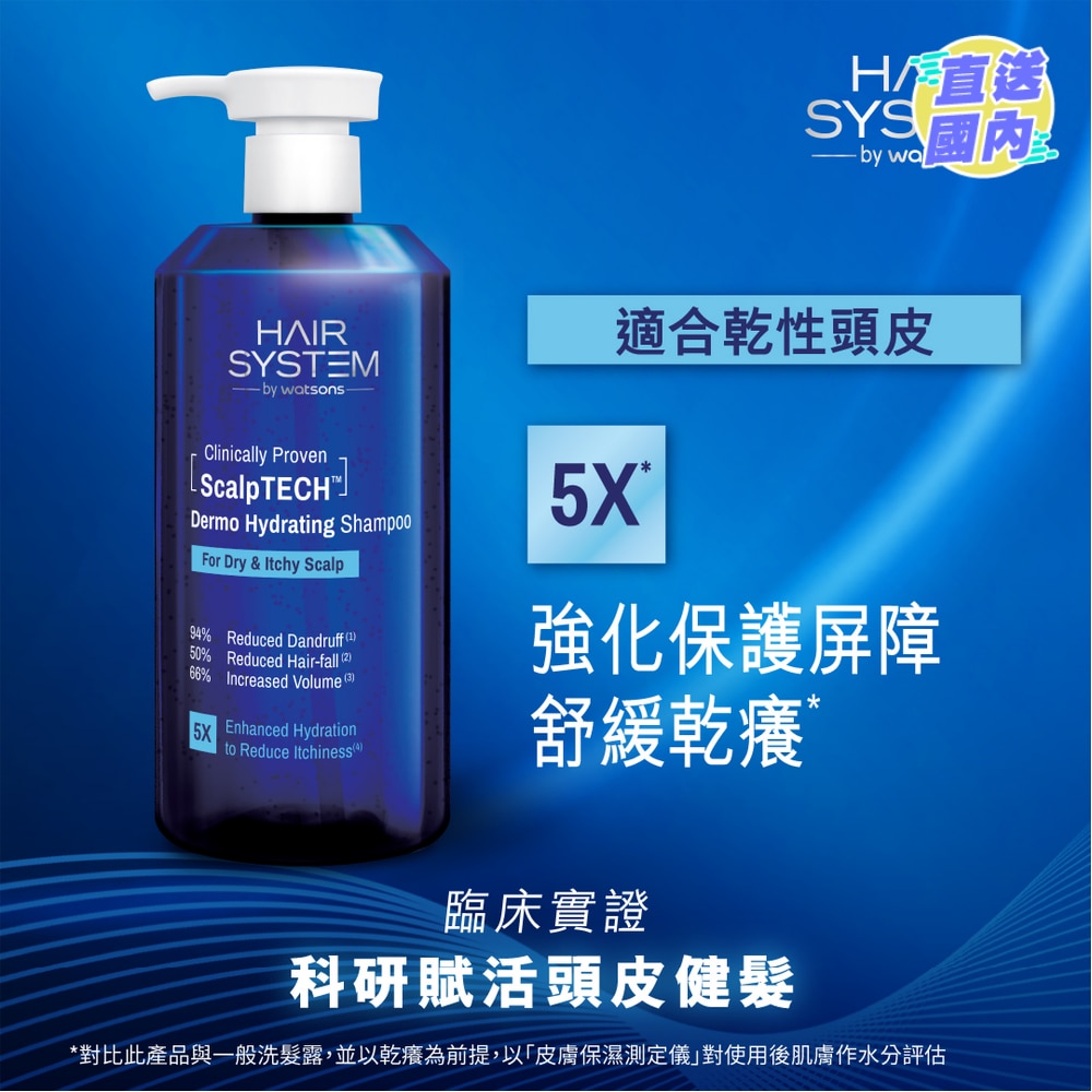 HAIR SYSTEM BY WATSONS SCALPTECH™ DERMO 保湿洗发精(适合干性头皮)能调理头皮平衡,保持湿润,并强化滋养发质。还能舒缓干燥,减缓不适,使头皮更加健康。