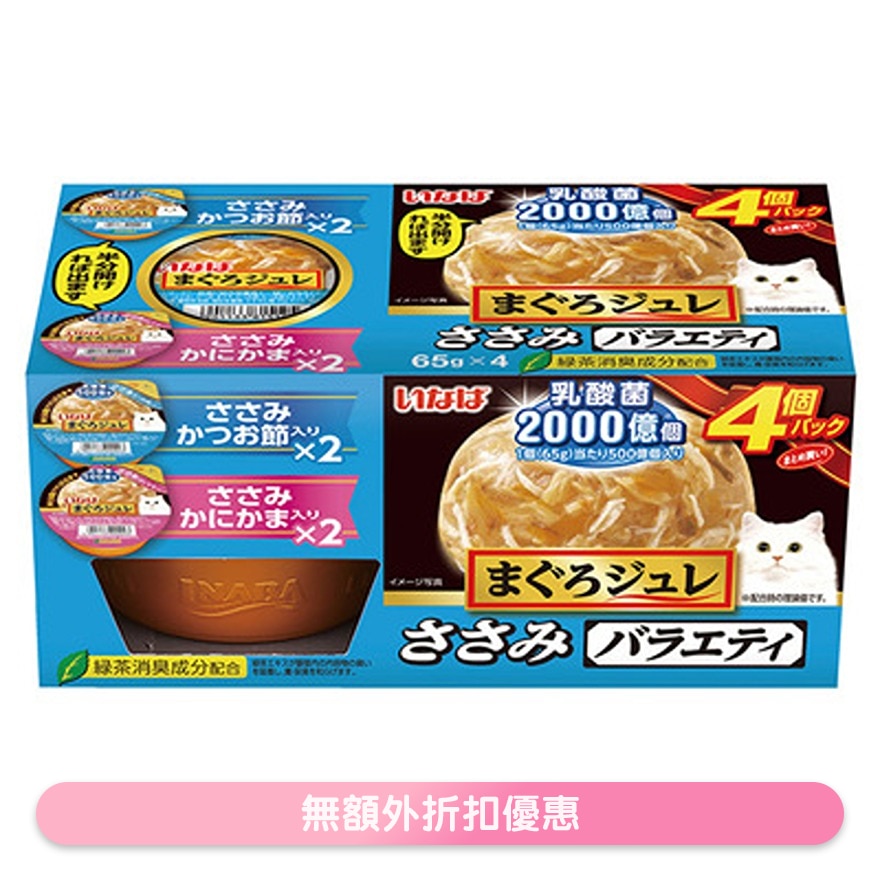鸡肉(鸡柳)、鲣鱼、吞拿鱼、蟹味鱼糕、乾鲣鱼提取物、鸡肉提取物、糖类(低聚糖等)、杀菌乳酸菌、植物油、增稠多糖类、矿物质(Na、P、Cl)、调味料(氨基酸)、维生素E、绿茶提取物