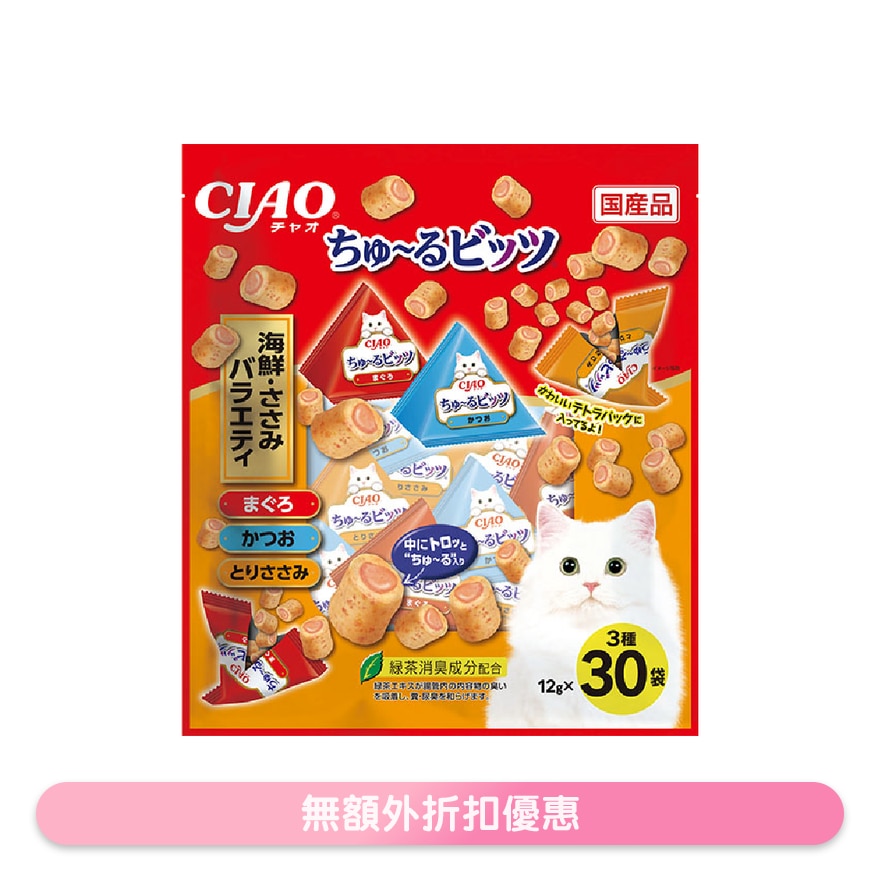 CIAO 流心粒粒猫小食 海鲜鸡肉什锦装(30包)这款零食外皮蓬松,内里软糯。这款什锦装包含三种不同口味,让您一次品尝到三种美味。