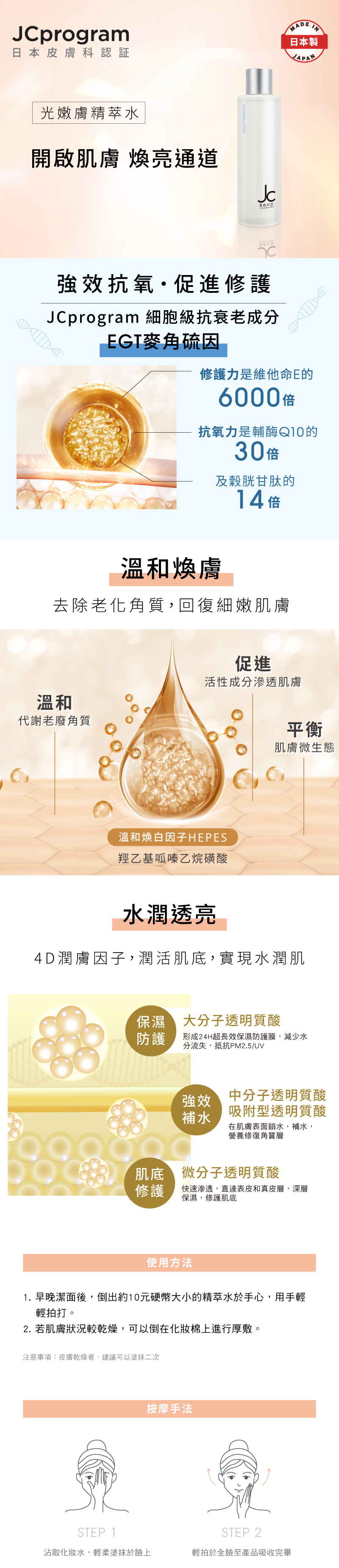 倒出10元硬币大小的精萃水于手心,用手轻轻拍打至脸部肌肤。皮肤干燥者,建议再涂抹拍打一次。
