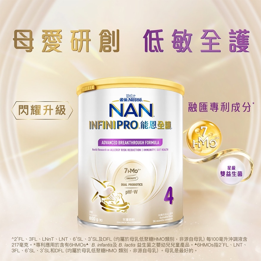 雀巢®能恩全护®4儿童奶粉是为36个月及以上健康儿童配制的成长奶粉,并非为母乳代用品。应尽可能持续喂哺母乳。