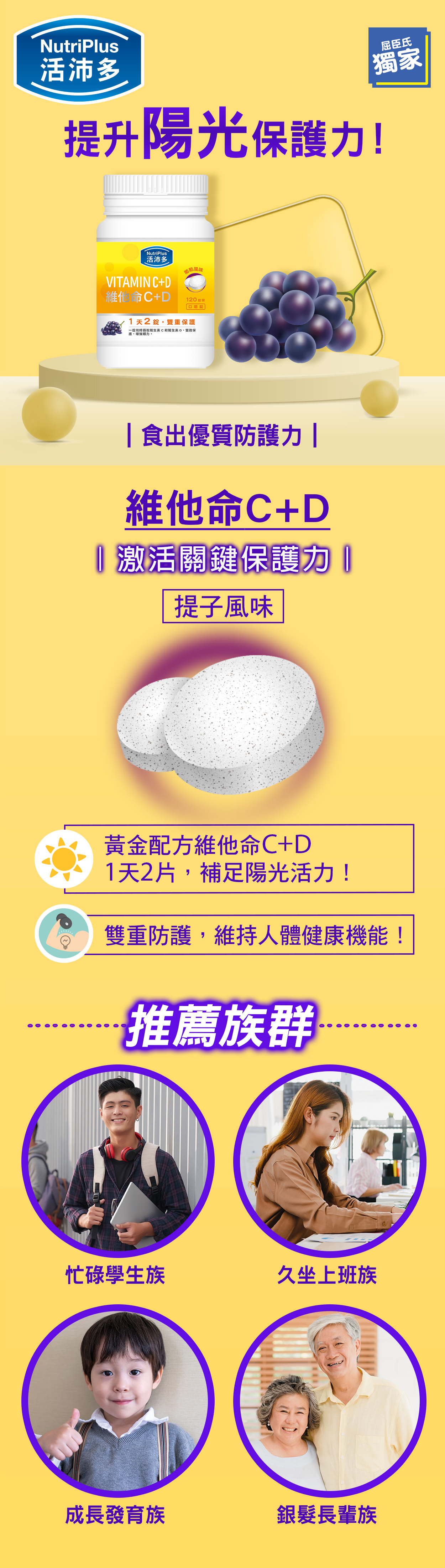 甜味劑 (D-山梨糖醇), 抗壞血酸鈉, 抗壞血酸 (L-抗壞血酸, 玉米澱粉), 葡萄果汁粉 [砂糖、紅葡萄果汁粉 [紅葡萄濃縮汁、麥芽糊精、增稠劑 (辛烯基琥珀酸鈉澱粉)]、增稠劑(辛烯基琥珀酸鈉澱粉)、調味料 (葡萄)、酸度調節劑(蘋果酸 )、色素(葡萄皮提取物 )、色素(醬色IV )、酸度調節劑(檸檬酸鈉 )、酸度調節劑(檸檬酸 )、酸度調節劑(D-酒石酸 )], 抗結劑 (硬脂酸鎂), 葡萄風味粉 [麥芽糊精、海藻糖、調味料、增稠劑(辛烯基琥珀酸鈉澱粉)], 抗結劑 (二氧化硅), 膽鈣化醇(維他命D3)[增稠劑(辛烯基琥珀酸鈉澱粉)、蔗糖、抗氧化劑(抗壞血酸鈉)、中鏈三酸甘油酯、抗結劑(二氧化硅)、抗氧化劑(DL-Α-生育酚)、膽鈣化醇], 甜味劑 (醋磺內酯鉀)