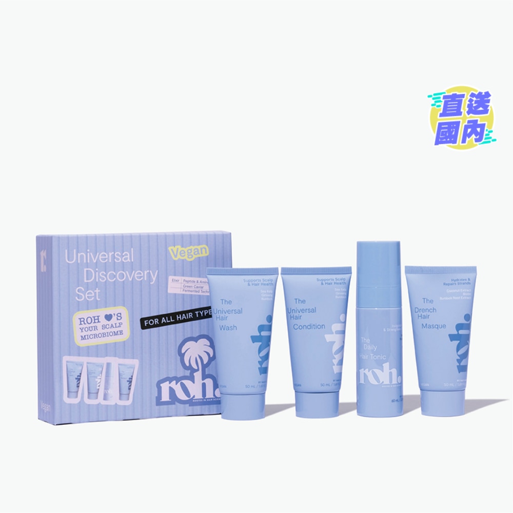 源自头发科研,ROH 深度呵护头皮微生态。全效洗护系列4合1体验套装—— ROH 洗护系列蕴含丰富营养,运用发酵科技,强韧、补水并保护秀发。海藻、人参、功能性胜肽与氨基酸,凝聚自然与科技的力量,层层滋养发丝,唤活头皮能量,维护头皮与秀发的最佳健康状态。