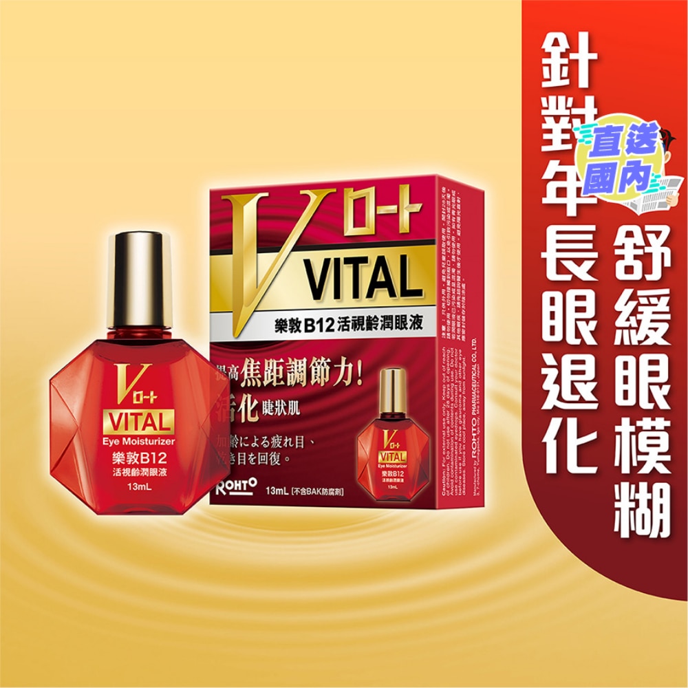乐敦首创针对年长眼退化,推出乐敦B12活视龄润眼液,蕴含最高浓度维他命B12,活化眼球睫状肌,有助焦距调节力、 对抗眼疲劳、滋润双眼