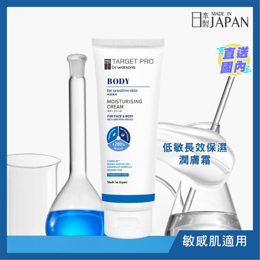 TARGET PRO BY WATSONS 低敏长效保湿润肤霜配方滋润质地不黏腻,修复肌肤屏障并锁紧肌肤水分。 涂抹后为肌肤维持长效保湿**及滋润,令肌肤保持润泽柔滑,有效减少脱皮及龟裂等肌肤问题。