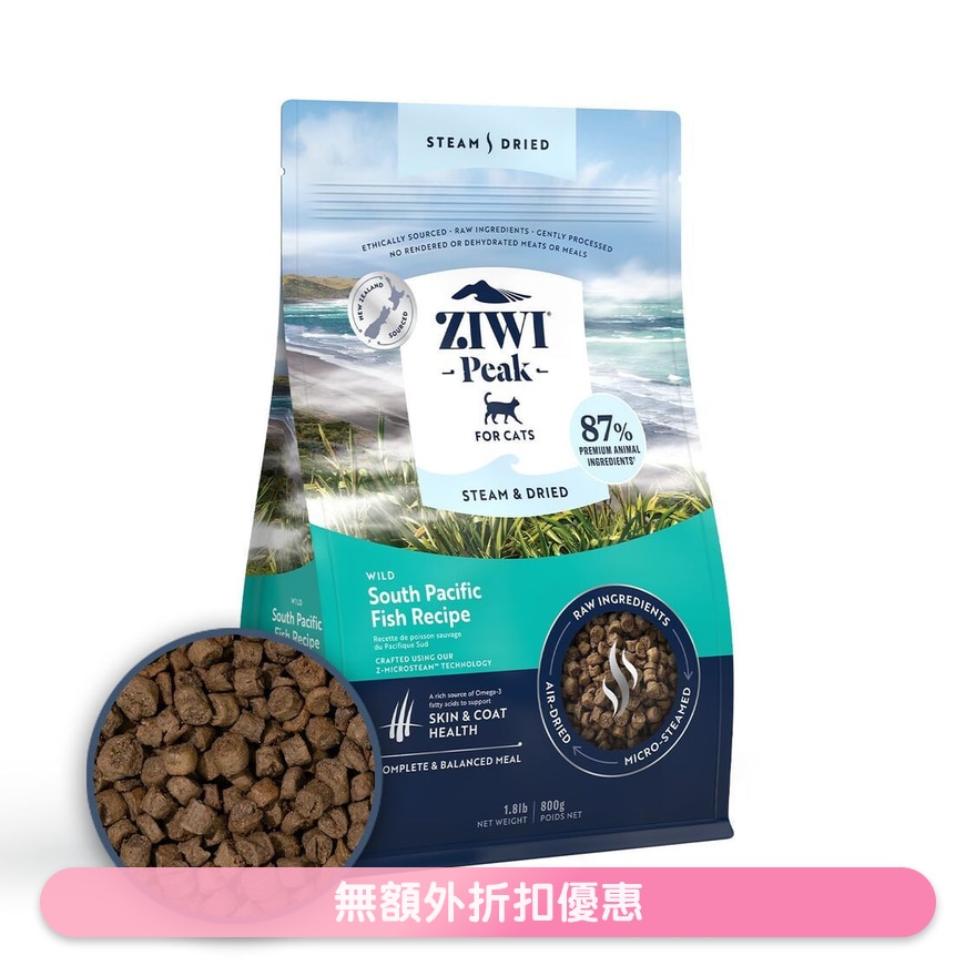 原条竹䇲鱼(葡萄糖胺及硫酸软骨素 来源),蓝鳕鱼,原条南蓝鳕,原条沙丁鱼,原条鲭鱼,鸡,鸡脂肪,黄色豌豆乾,绿色扁豆乾,乾蛋白,卵磷脂,藜麦乾,乾苹果蓉,天然香料,胆碱氯化物,矿物质(二钾 磷酸盐,镁 硫酸盐,氨基酸锌复合物,氨基酸铁复合物,氨基酸铜复合物,氨基 酸锰复合物),天然防腐 (柠檬酸,混合生育酚),海带乾,牛磺酸,维他命 (维他命 E补充,烟碱酸 补充,硫胺素 单硝酸盐,?哆醇盐酸盐(维他命B6),泛酸钙,叶酸,维他命 D3补充),迷迭香萃取物。