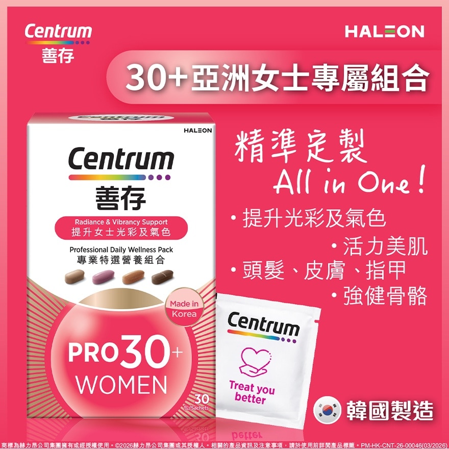 善存致力於營養科學研究超過 40 年,知道不同年齡有顯著不同的健康需求,需配合特別營養成分,以支持全面不同營養需要。善存專業特選營養組合"女士30+"專為30歲以上女士研發,經科研設計及專研調配的多種維他命及多種營養素組合,全面, 均衡及精準營養支持30歲以上女士不同需要,如皮膚,頭髮,指甲健康, 骨骼健康,保持年輕狀態及整體健康。