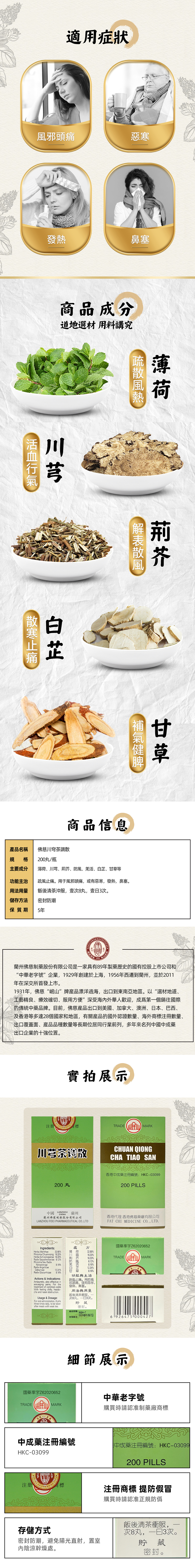 疏風止痛。用於風邪頭痛, 或有惡寒, 發熱, 鼻塞。