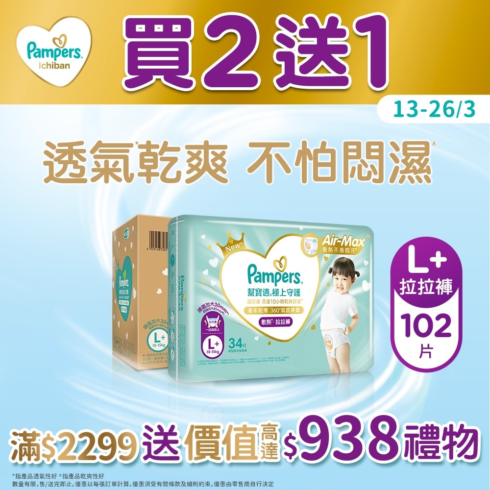 買Pampers產品 滿$999送香港濕地公園換票券(成人2張); $1599加送多用途煮食鍋1.5公升; $2299加送Kids Star Flash-Move 滑板車- 軍綠色 . 數量有限, 送完即止。不適用於任何特快模式。[網店限定]
