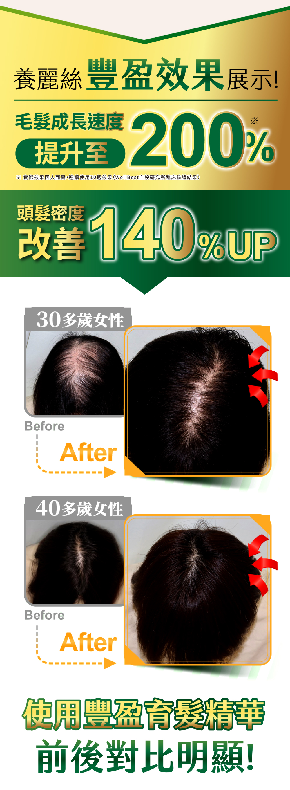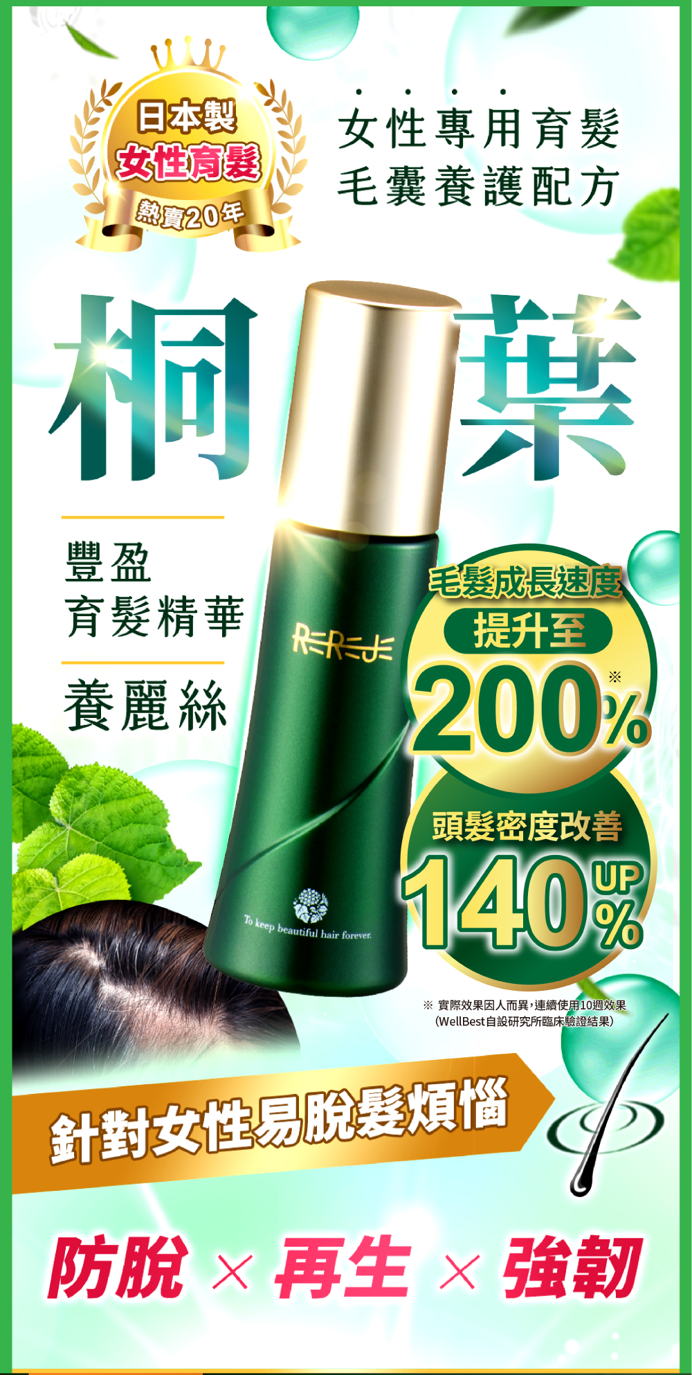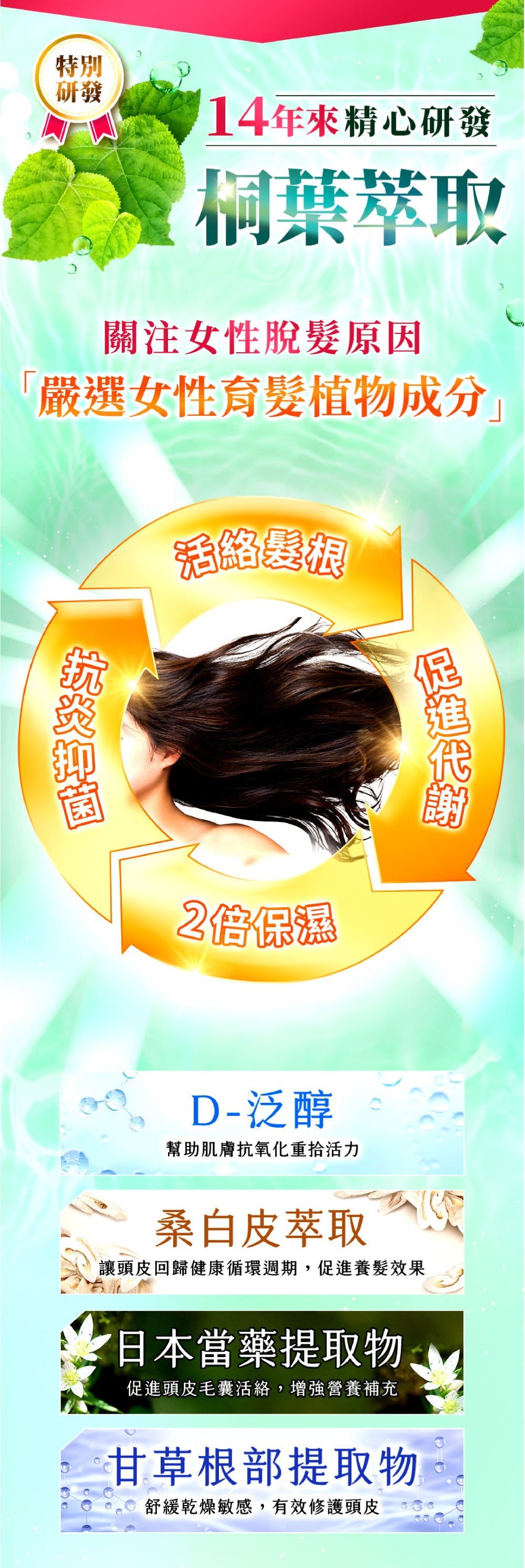 產品含專利成份「泡桐葉萃取物」,在100名體驗者的臨床試驗中,85%的女性證實具有生髮效果#