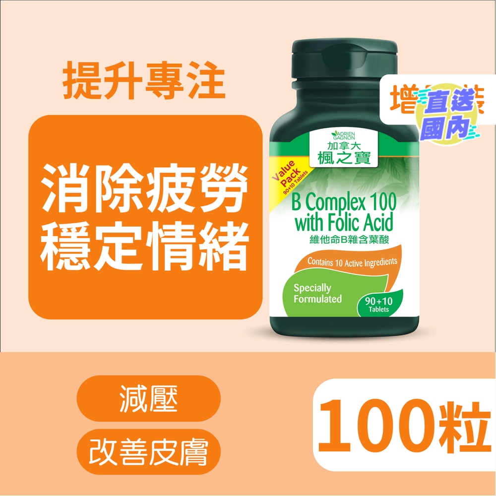 Vitamin B1 :100mg Vitamin B2: 100mg Vitamin B3: 100mg Vitamin B6 :100mg Vitamin B12: 100mcg Pantothenic acid: 100mg Choline bitartrate :100mg Inositol: 100mg Folic Acid :400mcg Biotin :100mcg