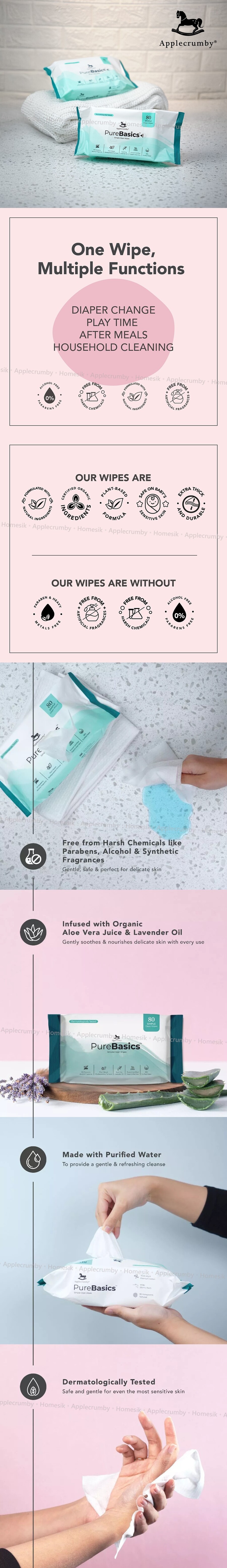 日常護理濕紙巾以98%純化水製成,經皮膚科測試,含有機蘆薈汁和薰衣草油,可滋潤並舒緩敏感肌膚,而且不含刺激性化學物質、酒精、香料和對羥基苯甲酸酯,為脆弱肌膚提供溫和安全的清潔。