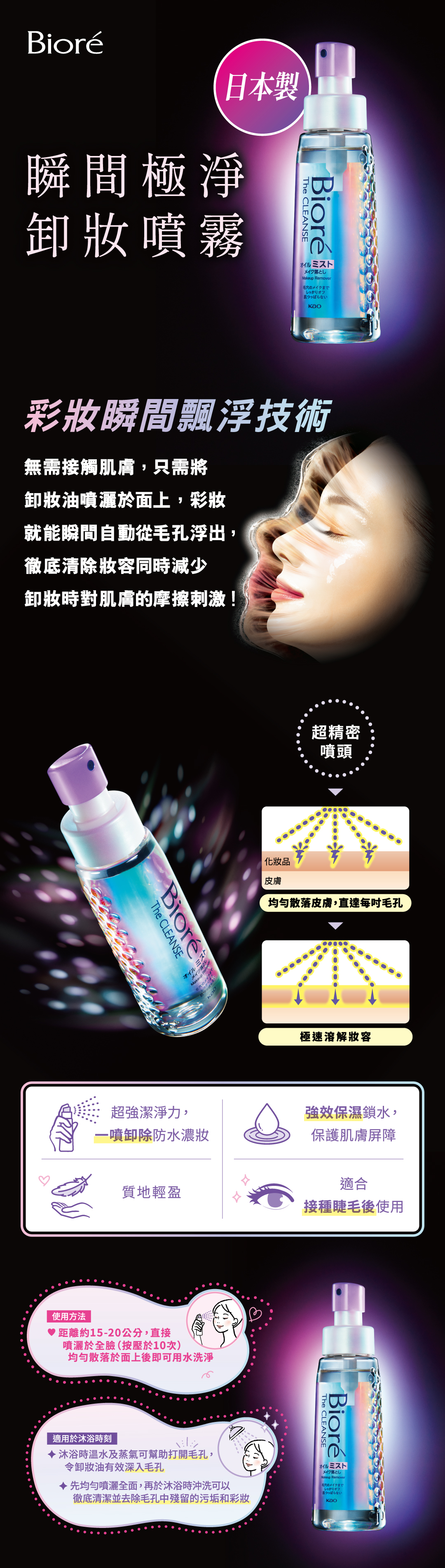 超精密噴頭設計,一噴卸妝油瞬間覆蓋肌膚,極速滲透肌膚底層,無需接觸肌膚就能輕鬆溶解頑固彩妝。