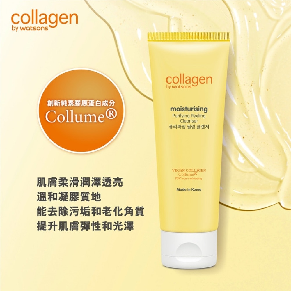 COLLAGEN BY WATSONS淨澈去角質潔面啫喱具有溫和的凝膠質地,輕柔按摩後便可去除污垢和老化角質,提升肌膚彈性和光澤,使肌膚柔滑潤澤透亮。