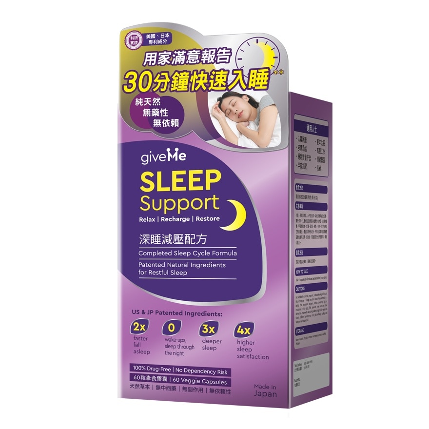 藥劑師推薦配方,專為照顧完整睡眠週期而研發,從淺眠(N1/N2)到深層睡眠(N3)讓身體、器官和大腦有時間休息、保存體力和自我修復,再到REM階段促進記憶、整理情緒。GIVEME SLEEP SUPPORT 深睡減壓配方,採用美國、日本專利草本,VENETRON® 、GABA#、合歡皮萃取、茶花種子萃取及菜薊葉萃取,臨床實證能加快入睡、提高熟睡程度、減少扎醒次數以及睡醒後對睡眠的滿足感。完整睡眠提升健康,讓你一覺醒來,感覺清爽、精力充沛,是身心最佳狀態的關鍵。