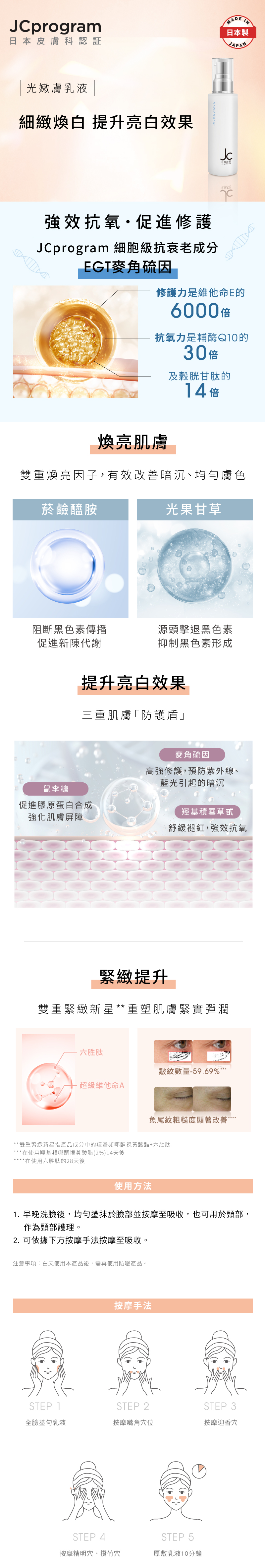 早晚洗臉後,均匀塗抹於臉部並按摩至吸收。也可用於頸部,作爲頸部護理,白天使用本產品後,再使用防曬產品。