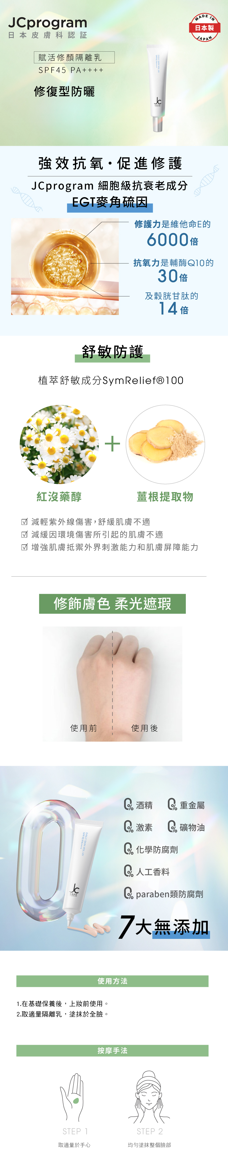 基礎護膚後,取適量本產品置於手掌,然後輕輕塗抹於臉部。