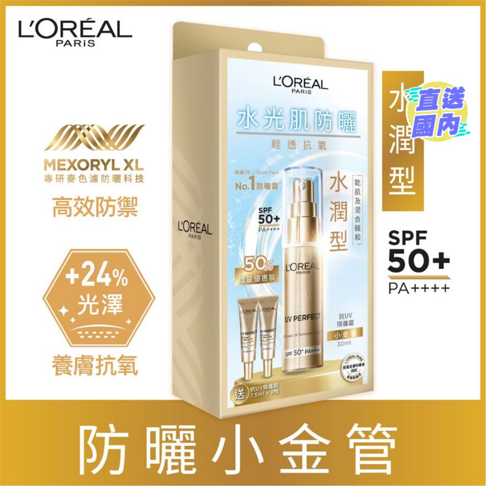 小金管幫助肌膚抵禦三重城市環境侵害(紫外線、污染微粒、氧化) 的防曬隔離霜。專利MEXORYL XL