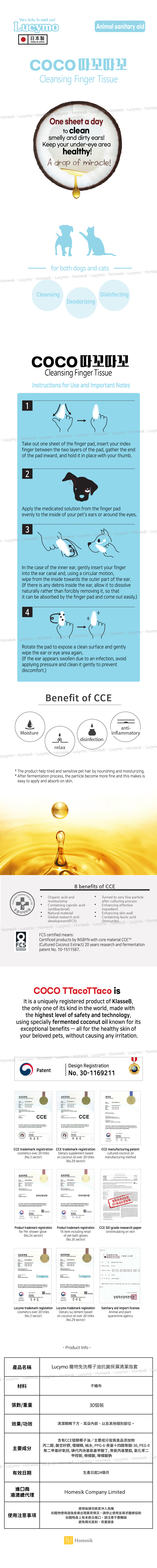 針對眼角及耳內等部位進行日常清潔與除臭處理,指套型方便使用,可清潔眼周淚痕、耳朵、下巴粉刺,達到消臭、抗菌、抗炎及改善耳道油膩的效果。產品無刺激性,富含發酵椰子油,能有效保濕滋養寵物皮膚,強化皮膚屏障