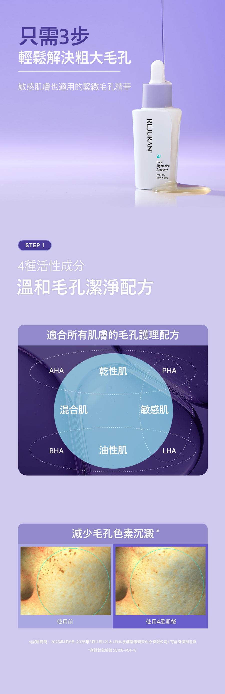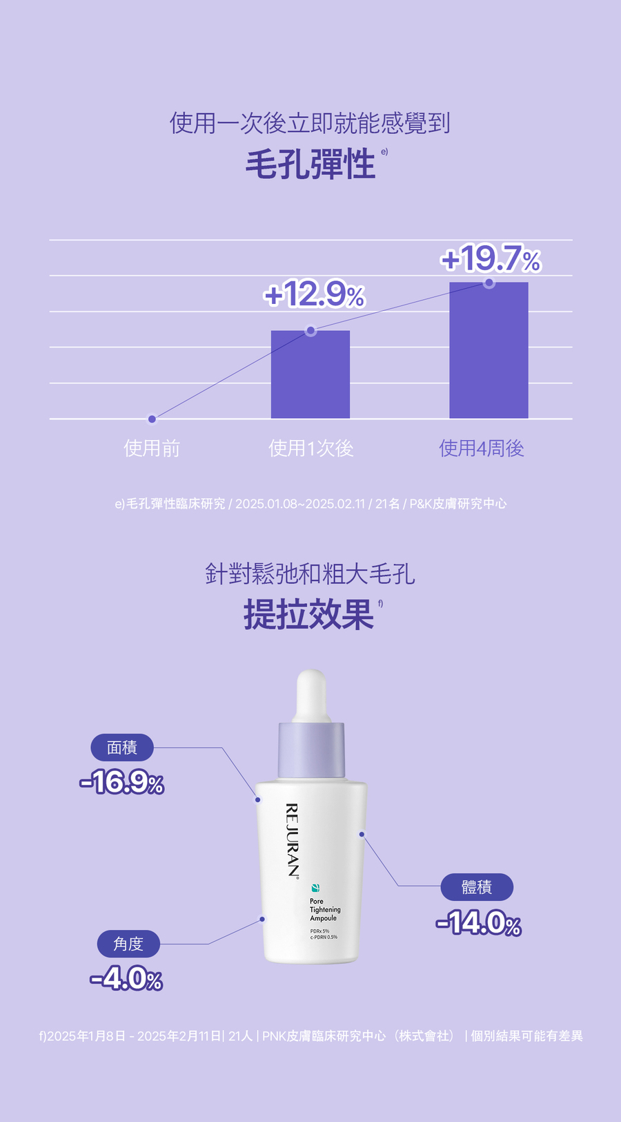 • 改善11大毛孔老化問題 : 臨床實證一瓶可改善11大毛孔老化問題,即時使用效果毛孔收細49.4%,持續使用4周後毛孔彈性提升19.7%