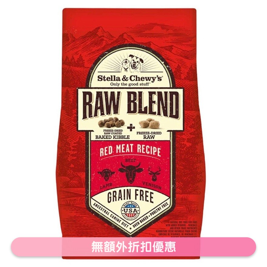 [Raw Blend] 紅肉配方,是採用豐富蛋白質,無榖物低溫烘焙乾糧,乾糧外層噴灑了凍乾生肉,再混合凍乾生牛肉粒。提供了一款方便,適口性極佳,又包含生肉豐富營養和鮮味的乾糧給您愛犬大快朵頤地享用!