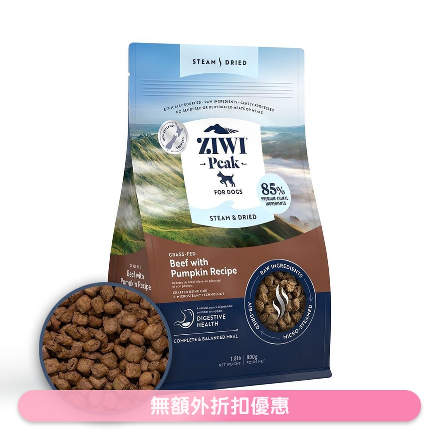 牛肉,牛肺,牛肚,牛肝,牛心,牛血漿,牛脾臟,牛骨 (葡萄糖胺及硫酸軟骨素 來源) ,卵磷脂,牛脂肪,綠色豌豆乾,綠色扁豆乾,南瓜,牛軟骨,南瓜乾,乾蘋果蓉,天然香料,藜麥乾,魚油,蕪菁甘藍,胡蘿蔔,甜菜,礦物質(磷酸氫二鉀,硫酸鎂,氨基酸鋅復合物,氨基酸鐵復合物,胺基酸銅復合物,硒酵母,氨基酸錳復合物),乾菊苣根,海帶乾,膽鹼氯化物,鹽,天然防腐 (檸檬酸 混合生育酚),維他命 (維他命-E補充,硫胺素 單硝酸鹽,泛酸鈣,核黃素,?哆醇鹽酸鹽 (維他命B6),維他命-D3補充劑,葉酸),迷迭香萃取物。